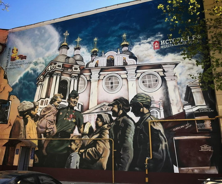 Изображение на фасаде Дома учителя – второе масштабное патриотическое граффити в Смоленске. Оба проекта реализованы под эгидой Российского военно-исторического общества, куда Антон Панфилов обратился с инициативой и предложил проект.