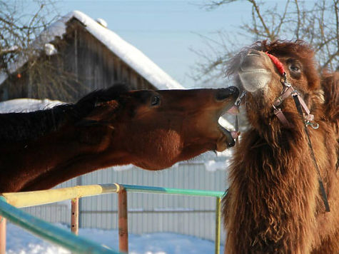 Вы когда-нибудь видели удивленную лошадь? Больше двух лет назад, когда мы впервые приехали в гости к Геше, мне посчастливилось наблюдать эту картину. Тогда еще лошади и верблюд редко встречались, так как Геша жил отдельно от лошадей. Поэтому они относились к нему достаточно настороженно. Это сейчас, за столько лет они попривыкли друг к другу и даже подружились, а тогда… Помните чудесный мультик, персонаж которого, увидев верблюда, произносит: «Впервые вижу такую уродливую лошадь!»? Вот именно так лошадки на него и отреагировали. Завидев удивительное животное, они сначала замерли, потешно расставив в стороны уши, приоткрыв «рты» и расширив глаза (да-да, именно так удивляются лошади!), а затем кинулись врассыпную. Но, потолпившись немного в сторонке, самые смелые стали потихоньку подходить к не менее растерянному Геше все ближе и ближе, испытывая страх и любопытство одновременно. Одна особенно отважная кобылка подошла вплотную, потянулась своей мордой к морде верблюда... Сначала это выглядело достаточно мило, но потом стало ясно, что она просто-напросто решила куснуть бедного верблюдика.
