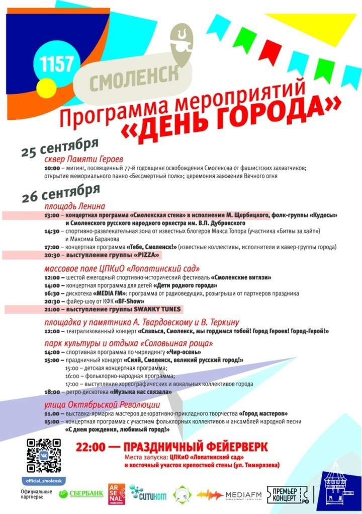 17:00 – концертная программа «Тебе, Смоленск!» (известные коллективы, исполнители и кавер-группы города)