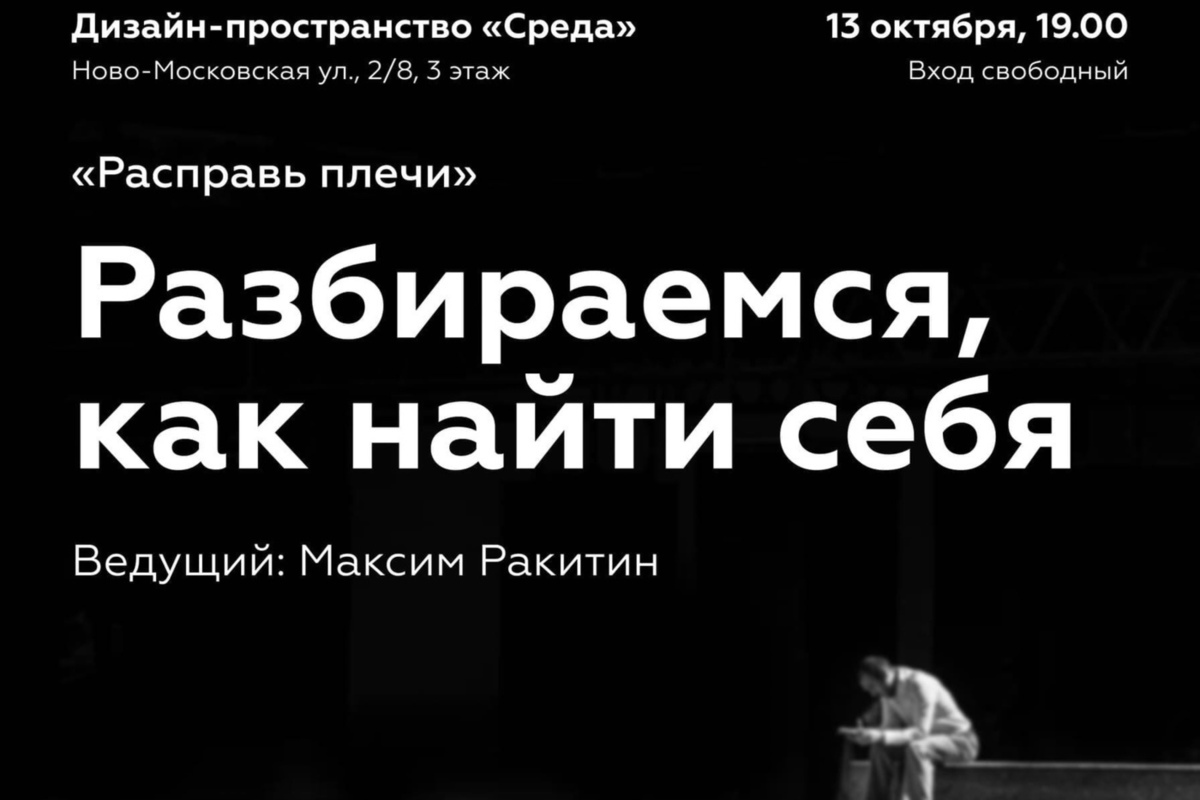 13 октября, во вторник, в 19:00 в дизайн-пространстве «Среда» (улица Ново-Московская, 2/8, 3-й этаж) состоится обсуждение на тему "Разбираемся, как найти себя".