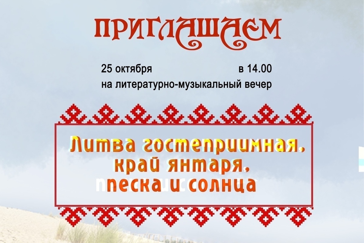 25 октября, в воскресенье, в 14:00 в литературной гостиной Смоленской областной библиотеки имени Твардовского состоится литературно-музыкальный вечер "Литва гостеприимная, край песка и солнца".