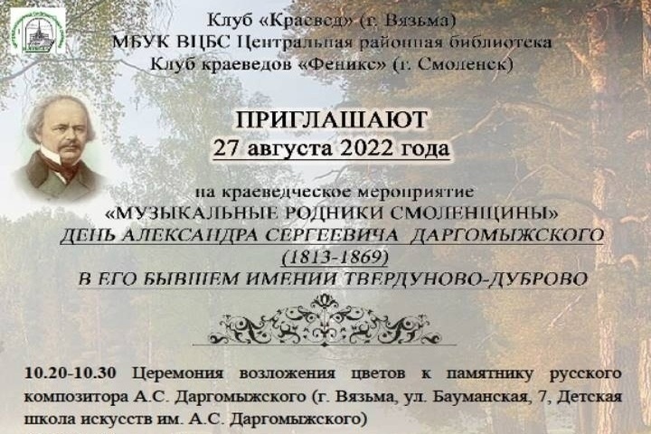 27 августа в Вязьме состоится краеведческое мероприятие "Музыкальные родники Смоленщины". Торжественные события приурочены ко дню рождения Александра Сергеевича Даргомыжского.