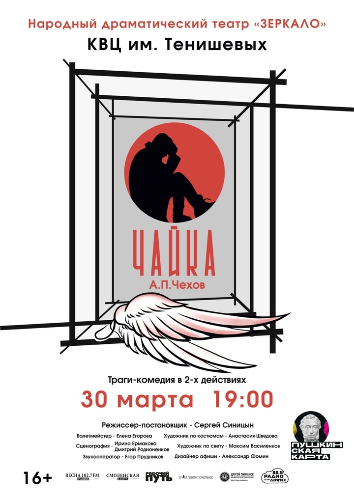 У жителей Смоленска есть отличная возможность увидеть своими глазами спектакль «Чайка». Актеры театра «Зеркало» сыграют его сегодня в 19:00 на сцене Культурно-выставочного центра имени Тенишевых.