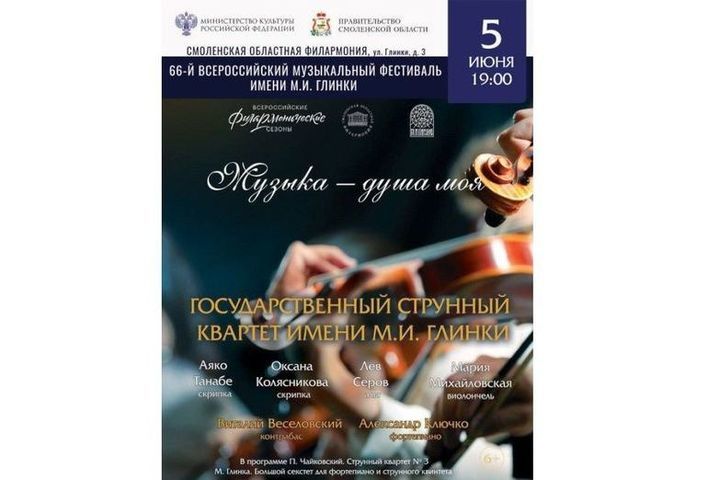 5 июня в 19.00 на сцене Смоленской областной филармонии Государственный струнный квартет им. М.И. Глинки представит концертную программу «Музыка - душа моя», посвященную 220-летию основоположника русской классической музыки.