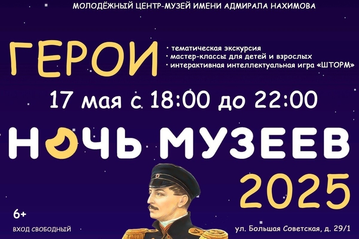 17 мая с 18:00 молодежный центр-музей имени адмирала Нахимова откроет свои двери для гостей и станет площадкой одного из самых ожидаемых событий весны — Ночи музеев 2025. Этот вечер обещает превратиться в настоящее путешествие по страницам истории, познакомит с морскими приключениями и тайнами, оставив яркие впечатления надолго.
