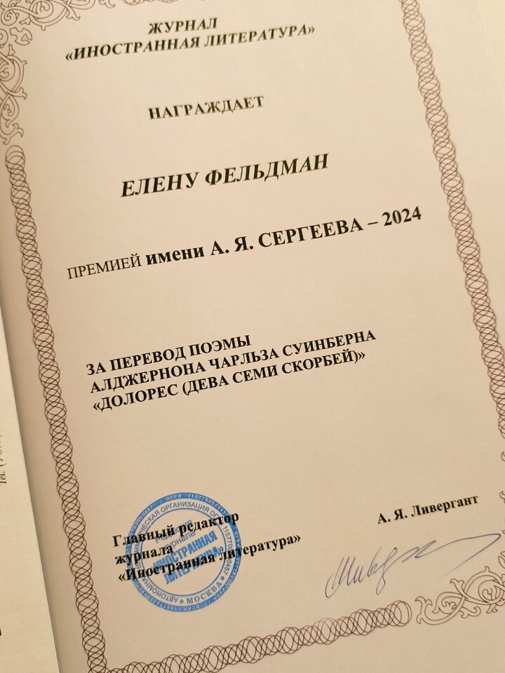 На встрече были объявлены лауреаты традиционных пяти премий журнала «Иностранная литература», которые распределяются среди лучших авторов и переводчиков за публикации прошедшего года. В этом году организаторы также учредили дополнительную шестую награду — премию А. Я. Сергеева, посвященную лучшему поэтическому переводу. Именно ее удостоилась смолянка Елена Фельдман за перевод масштабной эротической поэмы «Долорес (Дева семи скорбей)» классического английского поэта Чарльза Алджернона Суинберна (1837-1909).