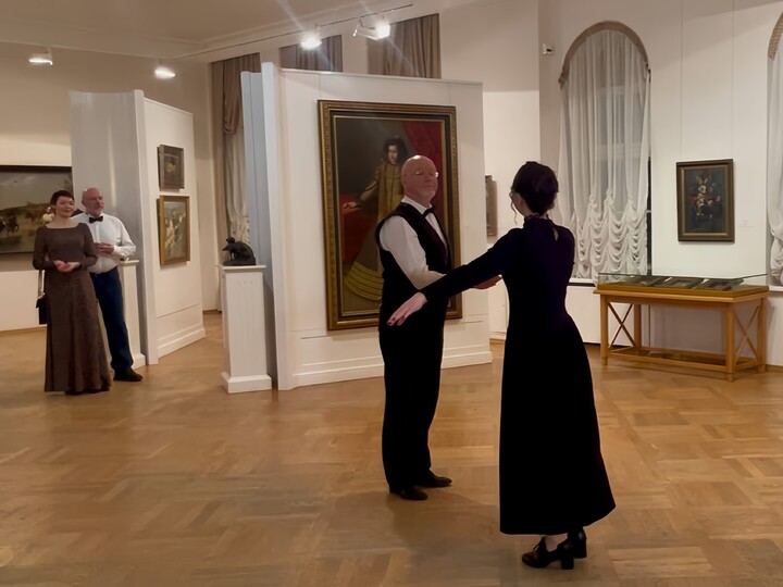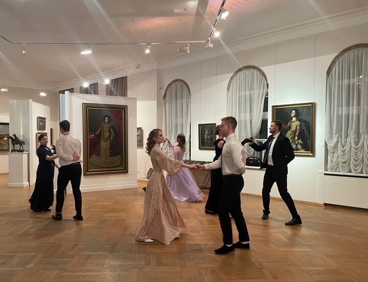 Вечер открылось зрелищно: элегантные дамы в роскошных вечерних платьях, мужчины в классических костюмах, чарующая мелодия вальса — атмосфера вдохновения витала в пространстве зала.