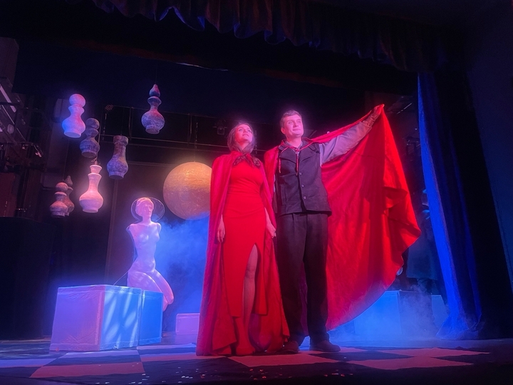 Необходимо отметить и оформление сцены. Над головами актёров возвышается огромная сфера – луна, медленно меняющая свои цвета и формы в зависимости от происходящих событий. От серебристых оттенков до зловещего красного сияния – эта деталь отражает внутреннее напряжение героев и динамику разворачивающейся борьбы добра и зла. Особую магию придавали висящие шахматные фигуры, их как бы невзначай постоянно задевали герои, напоминая зрителю, что идёт борьба света и тьмы.