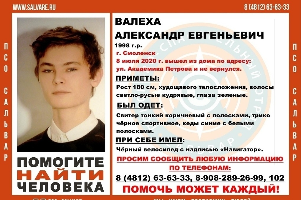 Добровольцы ПСО "Сальвар" объявили о поисках 22-летнего Александра Евгеньевича Валеха.