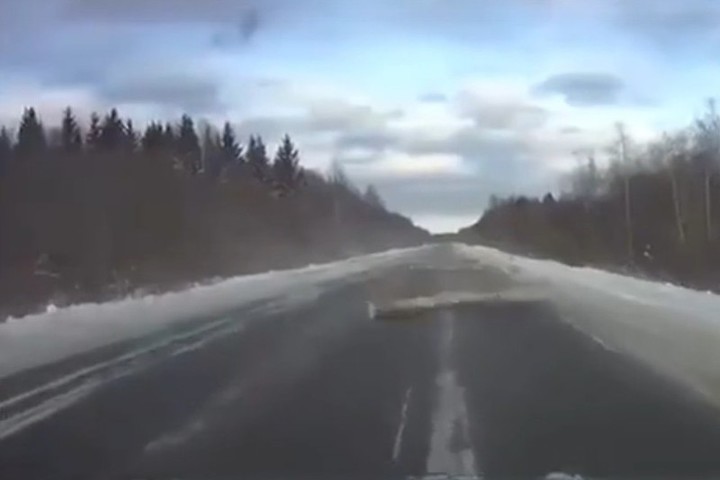 В социальных сетях смоляне обсуждают запись с видеорегистратора, на которой видно, как с лесовоза прямо на дорогу падают бревна.