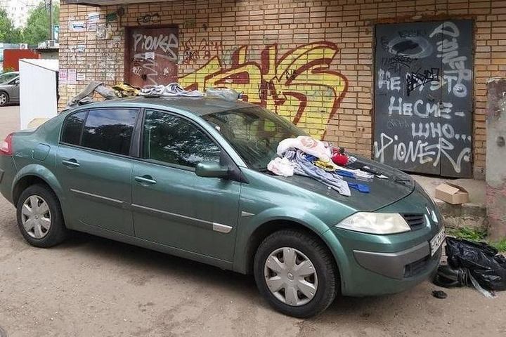 Они выложили фотографии и видео. На крыше и капоте автомобиля марки «Рено» оказались, кроме мусора, и старые вещи.