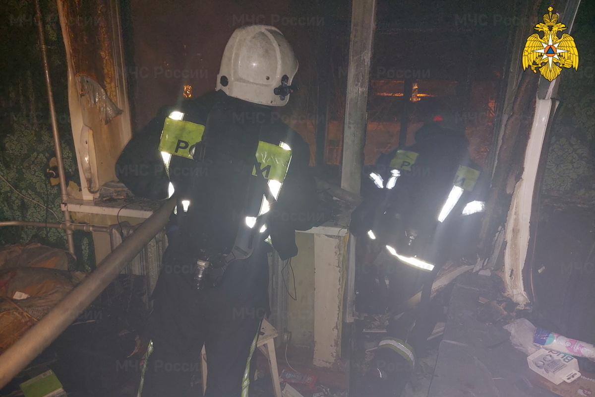 Балкон был полностью охвачен огнем. Специалисты звеньев газодымозащитной службы вошли в сильно задымленную квартиру для спасения людей.