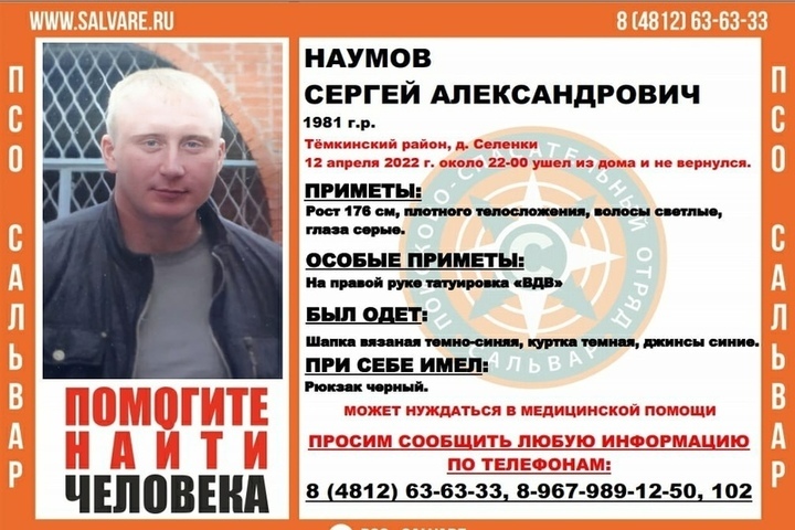 Сергей Александрович Наумов 1981 года рождения 12 апреля около десяти вечера ушел из дома в деревне Селенки Темкинского района. Он до сих пор не вернулся.