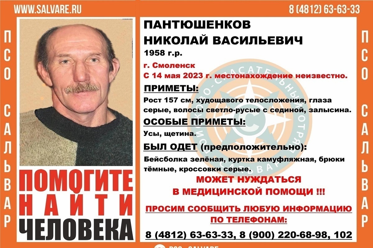 Как сообщили в социальных сетях, в официальном паблике поисково-спасательного отряда «Сальвар», Пантюшенков Николай Васильевич 1958 года рождения, проживающий в Смоленском районе, пропал 14 мая 2023 года. До сих пор его местонахождение неизвестны.