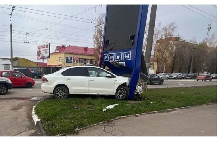 Тот стал уходить от столкновения и въехал в рекламный стенд заправки.