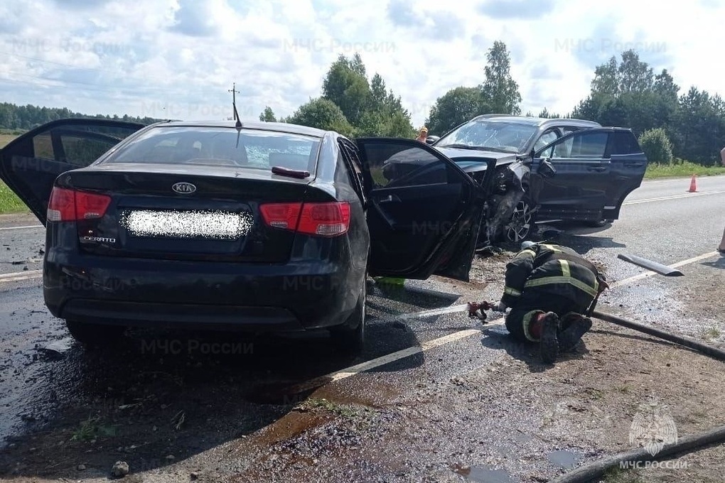 Днем 27 июля на автодороге в Новодугинском муниципальном округе, рядом с деревней Санники произошло лобовое столкновение двух легковых автомобилей КИА и Хёндэ.