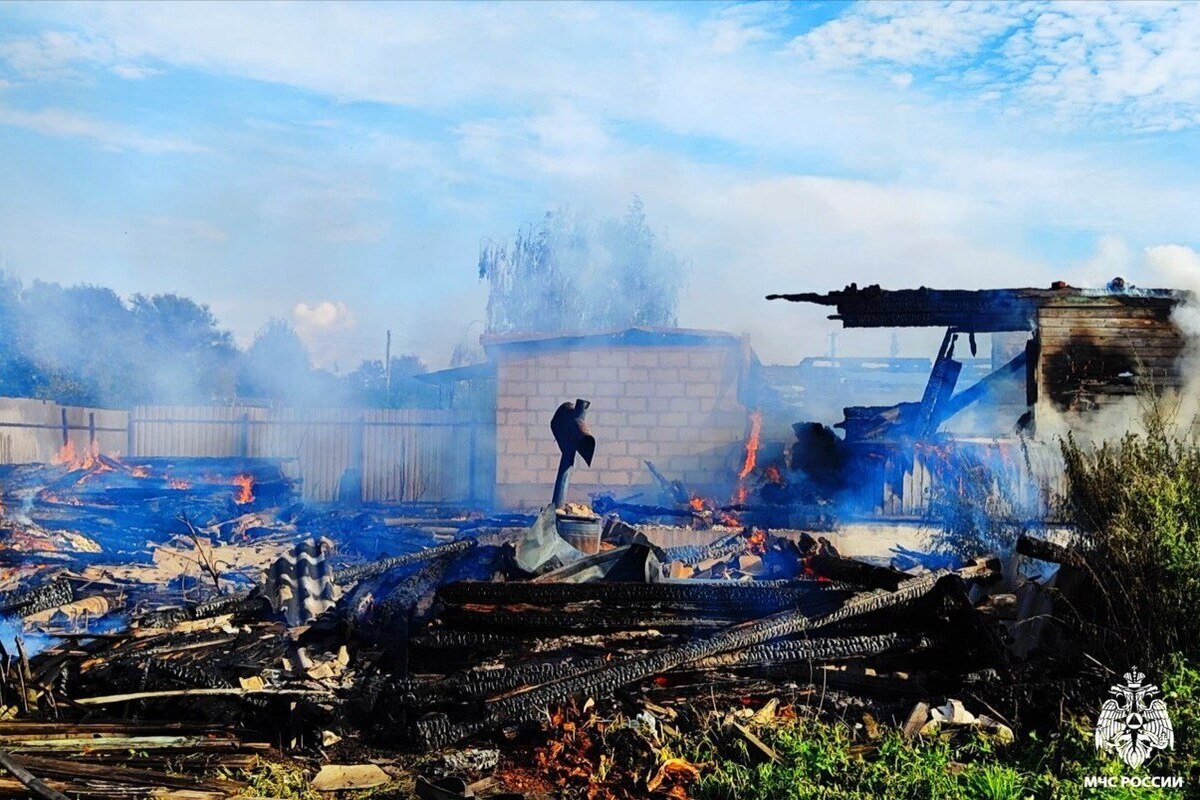 К моменту приезда сотрудников МЧС деревянные постройки уже были серьёзно повреждены огнём и вскоре выгорели практически полностью как внутри, так и снаружи; соседний гараж получил незначительные повреждения.