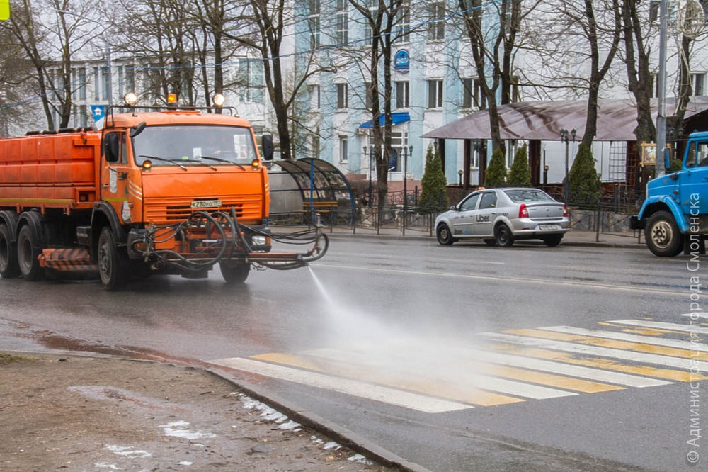 Городские спецслужбы вышли на борьбу с инфекцией. От центра к окраинам Смоленска дезинфицируют дороги, остановочные павильоны, детские площадки, пешеходные зоны и въезды/выезды из города.
