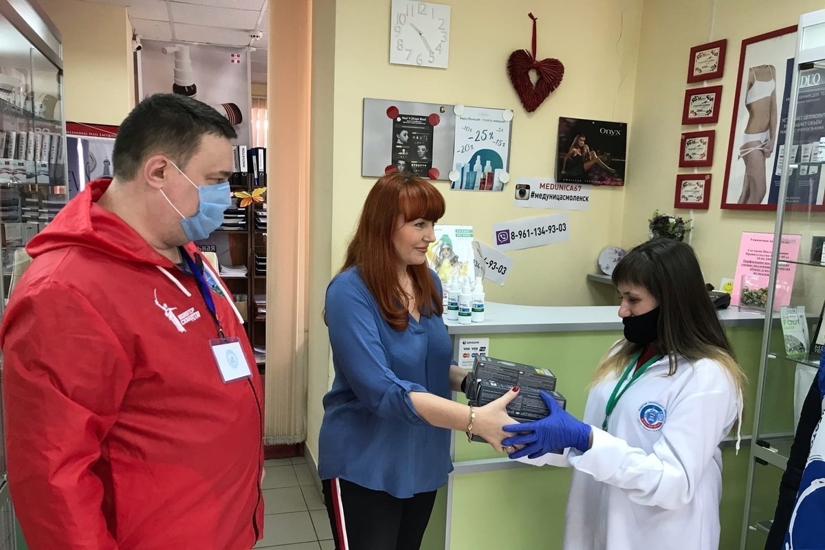 Вчера сотрудники ИП "Медуница" безвозмездно передали Смоленскому волонтерскому Центру по оказанию помощи наиболее уязвимым в условиях распространения коронавирусной инфекции категориям граждан средства защиты (перчатки, маски и дезинфекторы).