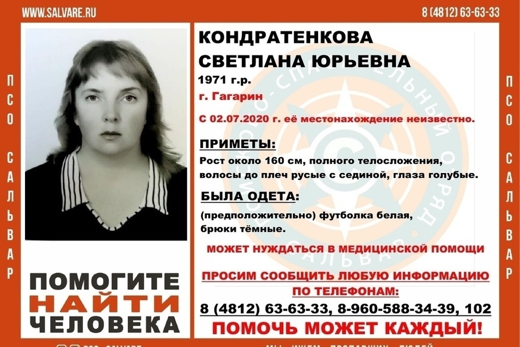 Добровольцы ПСО "Сальвар" объявили поиски 48-летней Кондратенковой Светланы Юрьевны из города Гагарина.