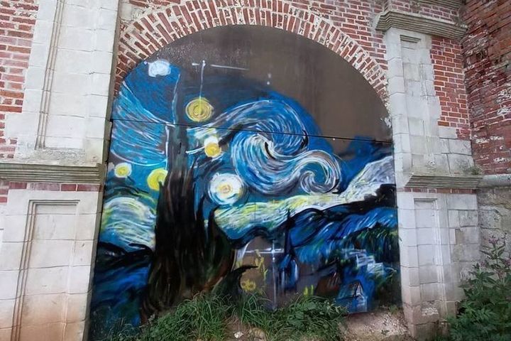 В Смоленске уличные художники расписали металлические ворота крепостной стены около башни «Орел». Они повторили картину Винсента Ван Гога "Звездная ночь".