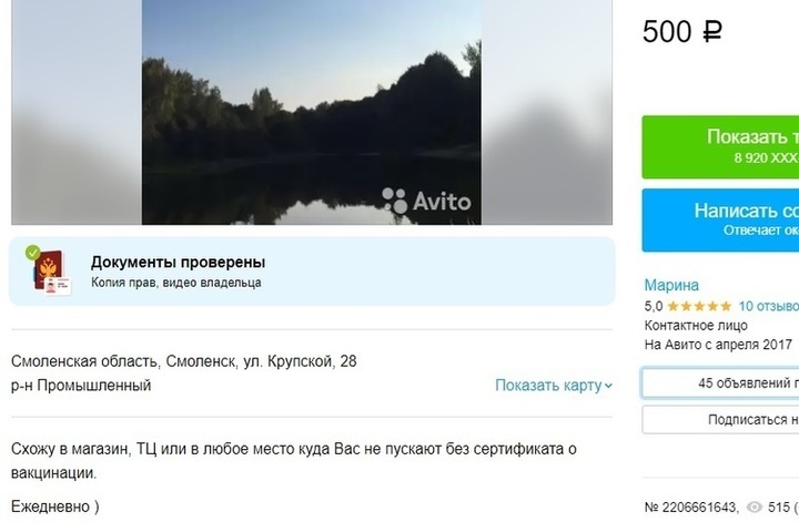 Жительница Смоленска утверждает, что вакцинирована от COVID-19, поэтому может без ограничений посещать торговые центры, магазины и любые места, куда без сертификата доступ закрыт. Свои услуги женщина оценила в 500 рублей. Также в объявлении сообщается, что она готова помочь невакцинированным смолянам ежедневно.