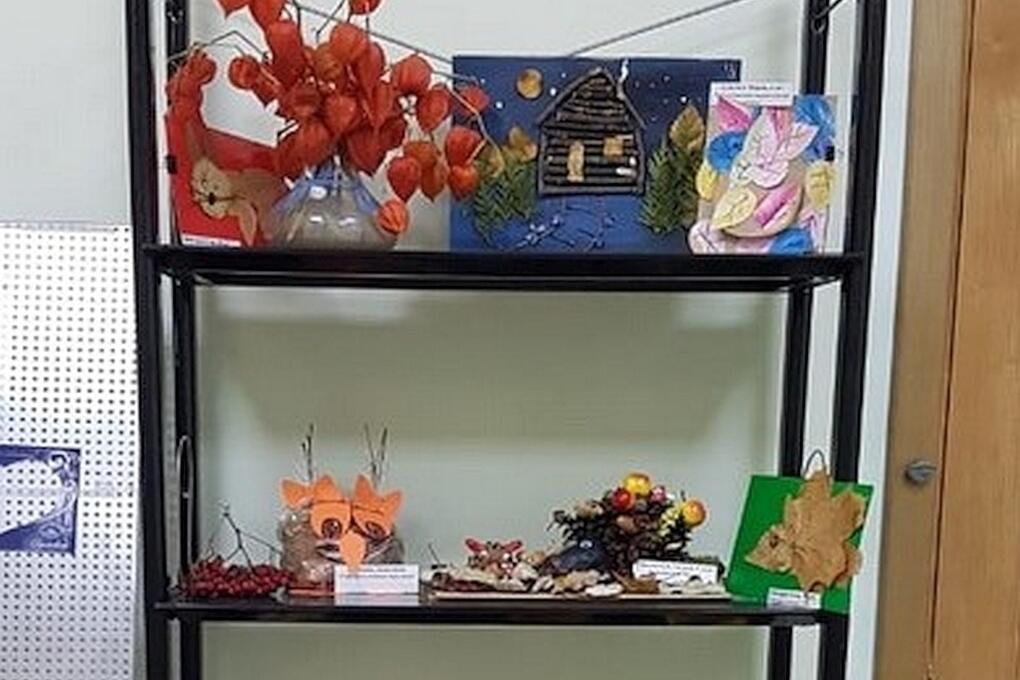 Экспонаты из листьев, рябины, шишек, яблок и других природных материалов разместили на стеллаже в фойе учреждения.