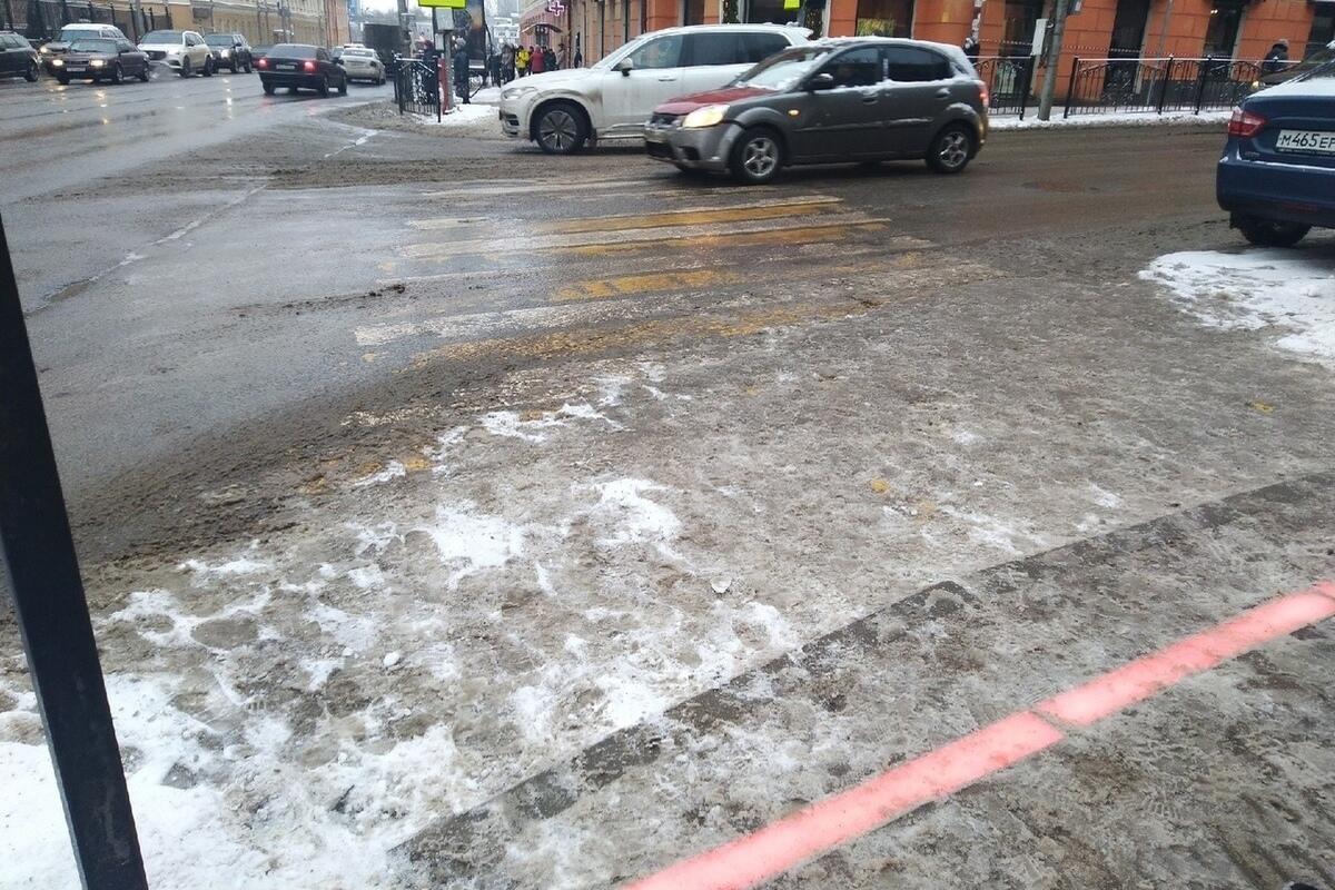 Проходящие по улице смоляне с интересом рассматривают новинку. Однако нормальной работе подсветки мешает снег, который в большом количестве накопился на одной из сторон пешеходного перехода и перекрывает светодиодные полосы, делая их малозаметными.
