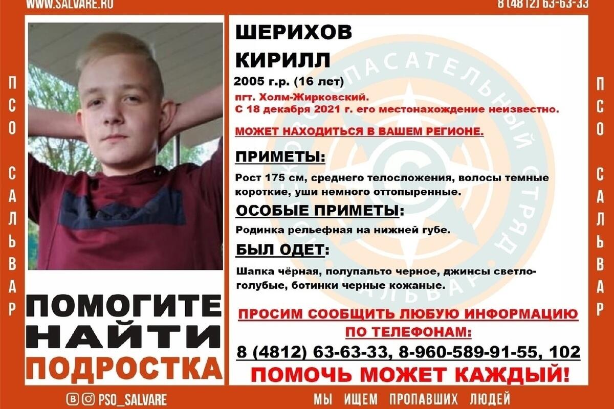 В Смоленской области ищут пропавшего 16-летнего Шерихова Кирилла. Мальчик пропал в поселке городского типа Холм-Жирковский 18 декабря, с тех пор о его местонахождении неизвестно. Ориентировка появилась в официальном сообществе ПСО «Сальвар».