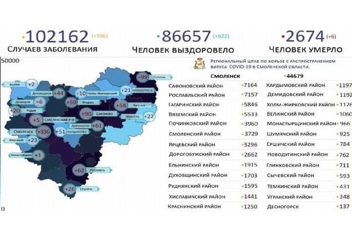 Смоленск: 44679 заболевших коронавирусом с начала пандемии (+336 за сутки)