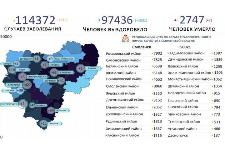 Смоленск: 50021 заболевших коронавирусом с начала пандемии (+427 за сутки)