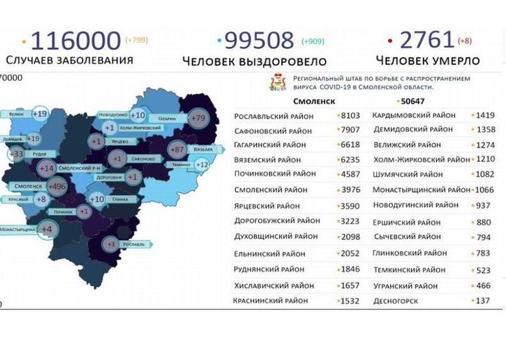 Смоленск: 50151 заболевших коронавирусом с начала пандемии (+130 за сутки)