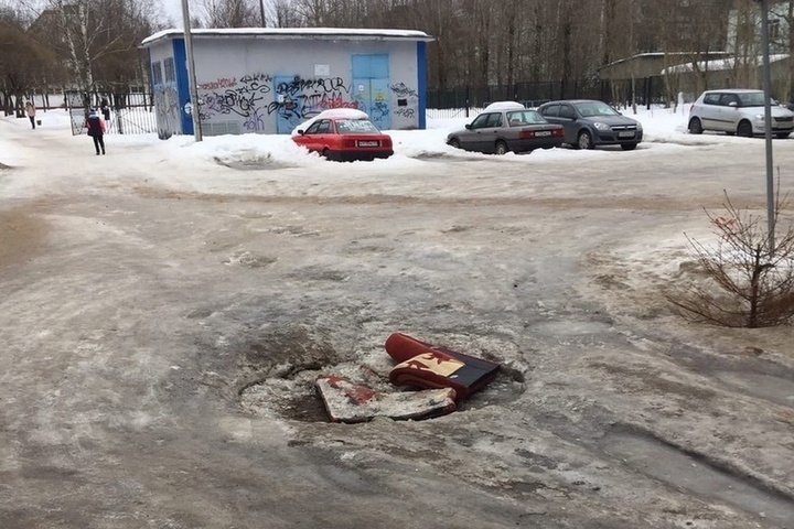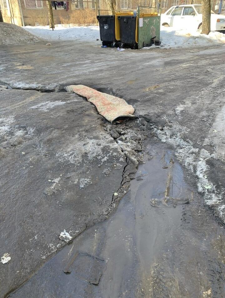 Уникальные подручные средства для устранения выбоин используются смолянами уже не в первый раз: 20 марта возле дома 4б по улице Рыленкова анонимный мастер залатал большую промоину на дороге старым ковром.
