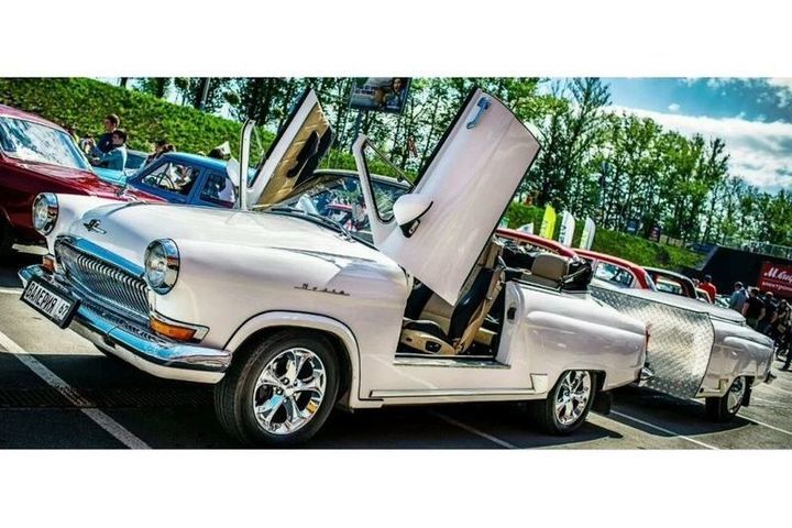 «Волга» ГАЗ-21 1964 года выпуска, купе-кабриолет, с гильотинными дверями. С аналогичным прицепом. Двигатель BMW 2,5 литра. Механика. Все документы в порядке, технические изменения зарегистрированы.