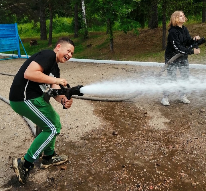 Особый восторг гостей стала подача воды из лафетного ствола. Юные смельчаки даже смогли сами подать воду в очаг условного пожара, конечно же под контролем опытных пожарных