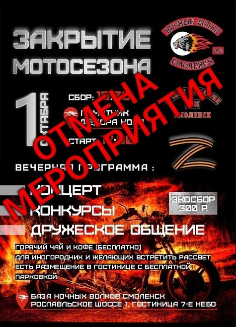 Закрытие мотосезона, которое байк-клуб «Ночные волки» запланировал на 1 октября будет проходить без традиционного концерта и развлекательной программы.