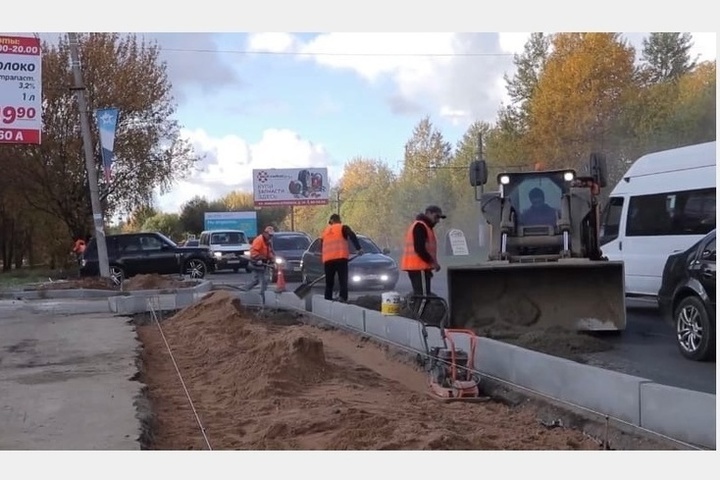 Нижний слой асфальта здесь уложили еще на прошлой неделе. Сейчас на обновляемой улице ведется ремонт тротуаров и замена бортового камня.