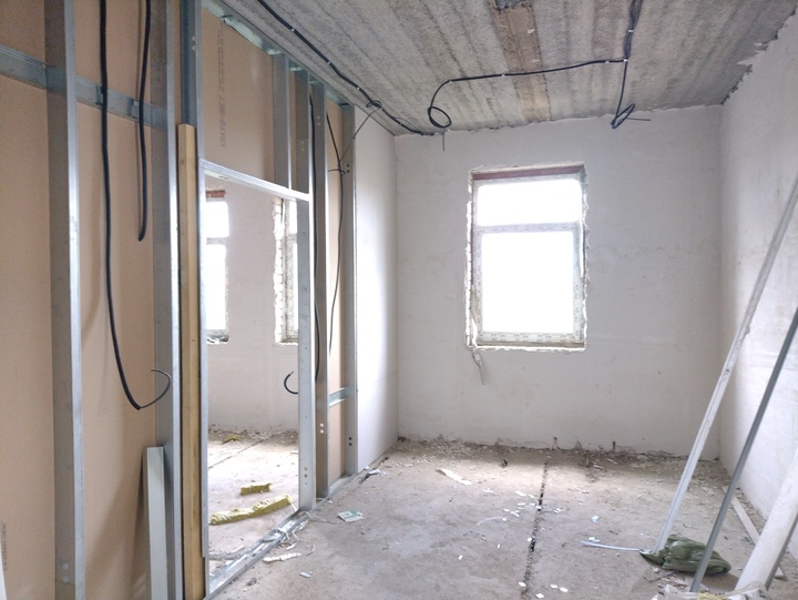 В настоящее время уже на 50% выполнен демонтаж кровли. Выстроены внутренние перегородки из ГКЛ, произведена разводка электрического освещения и электропитания.