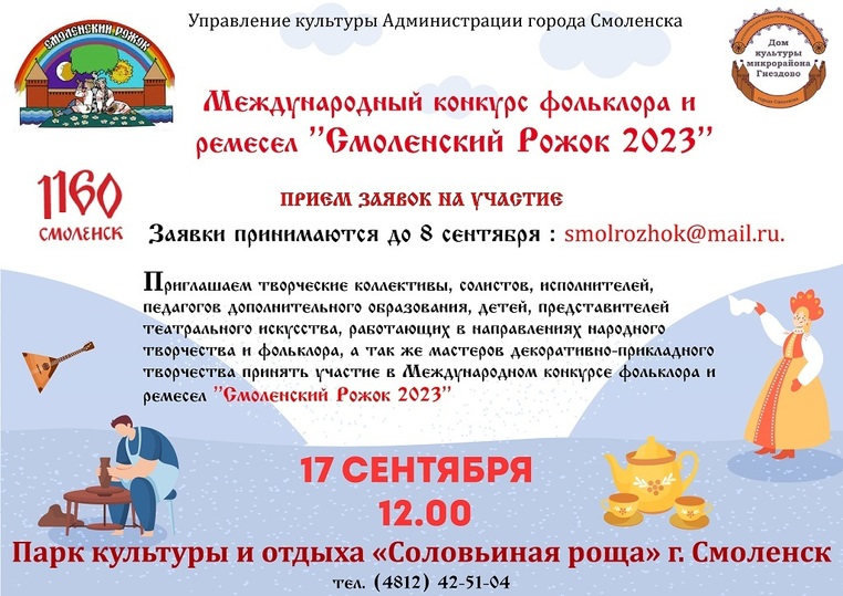 17 сентября муниципальный Дом культуры «Шарм» при поддержке Управления культуры Администрации города Смоленска проведет Традиционный конкурс «Смоленский рожок» на площадке парка культуры и отдыха «Соловьиная роща».