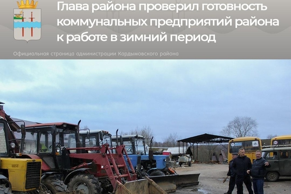 Глава Кардымовского района Олег Смоляков проверил готовность к зиме районных коммунальных предприятий МУП «ТЭР» и Кардымовское ДРСУ. Предметом проверки стало наличие и состояние имеющейся снегоуборочной техники