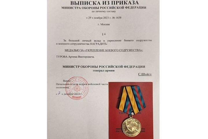 Депутат Государственной Думы от «Единой России» Артём Туров приказом Министра обороны РФ Сергея Шойгу награжден медалью «За укрепление боевого содружества» за большой личный вклад в укрепление боевого содружества и военного сотрудничества.