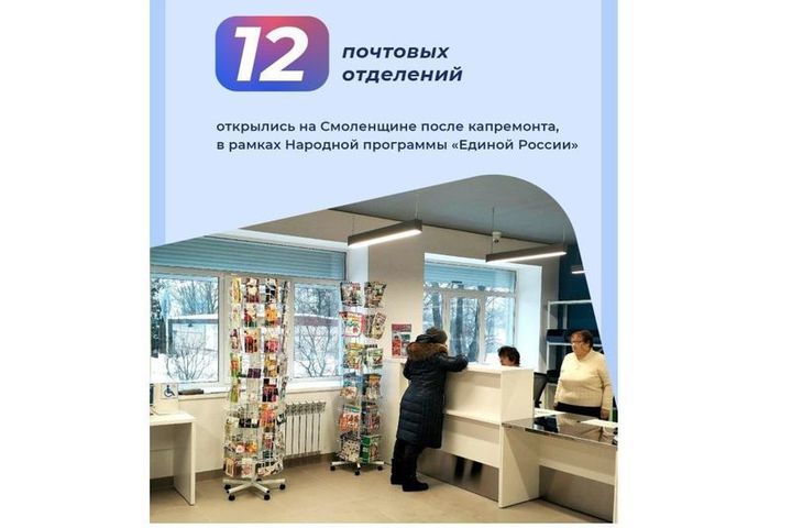 В 2023 обновлены 12 отделений связи в Капыревщине Ярцевского района, Токареве Гагаринского района, Новодугино, Пригорском Смоленского района, Рябцеве, Данькове Починковского района, Пречистом Духовщинского района, Семлеве Вяземского района, Угре, Глинке, Понизовье Руднянского района и в Рыбках Сафоновского района.