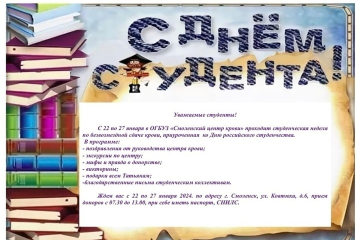 «Смоленский центр крови» с 22 по 27 января проведет студенческую неделю по безвозмездной сдаче крови. Посвящена она, безусловно, Дню российского студенчества.
