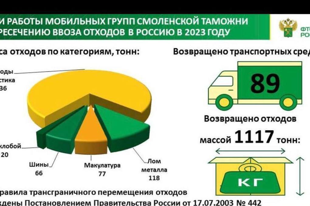 Смоленская таможня вносит огромный вклад в обеспечение экологической безопасности всей страны. В прошлом году должностными лицами мобильных групп ОКВОТ таможни остановлено и возвращено в страну отправления 89 транспортных средств с отходами массой 1 тыс. 117 тонн.