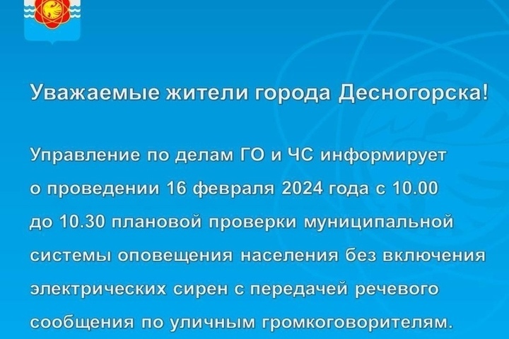 Управление по делам ГО и ЧС информирует жителей города атомщиков, что 16 февраля 2024 года с 10.00 до 10.30 пройдет проверка муниципальной системы оповещения населения «без включения электрических сирен с передачей речевого сообщения по уличным громкоговорителям». Так сказано в сообщении городской администрации.