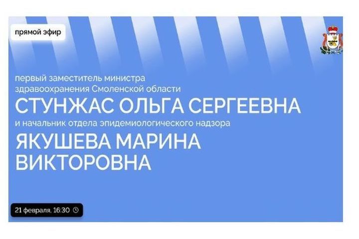 На вопросы смолян ответят первый заместитель министра здравоохранения Смоленской области Ольга Сергеевна Стунжас и начальник отдела эпидемиологического надзора управления Роспотребнадзора по Смоленской области Марина Викторовна Якушева.