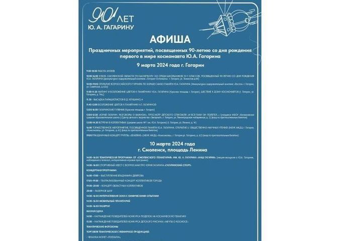 Правительство Смоленской области опубликовало программу празднования 90-летия со дня рождения Юрия Алексеевича Гагарина - первого космонавта планеты Земля.