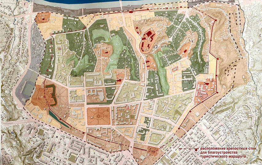 При площади предлагается возродить участок стены. В сторону площади регенерировать фасад стены в кирпиче с боевыми зубцами. В сторону исторического центра, в пластике стены использовать конструктивные приемы с остеклением. Участок восстановленной стены рассматривать как кафе или культурно-выставочная площадь.