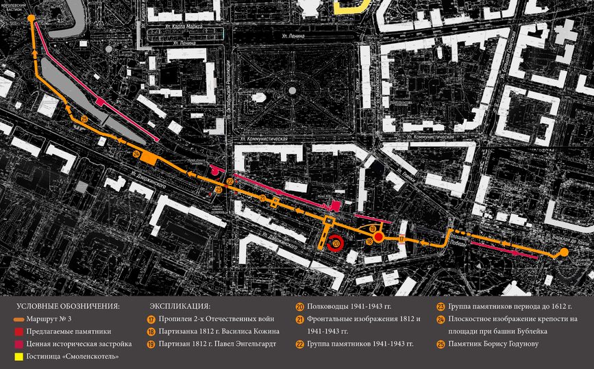 3-й маршрут - участок, посвященный "военным лихолетьям" Смоленска. От Шеина бастиона до Громовой башни, как мемориал двух Отечественных войн (1812 года и 1941-45 годов), и от Громовой башни до Королевского бастиона, как участок военной истории города до 1612 года, с перспективой насыщения маршрута памятными знаками (Схема 3).