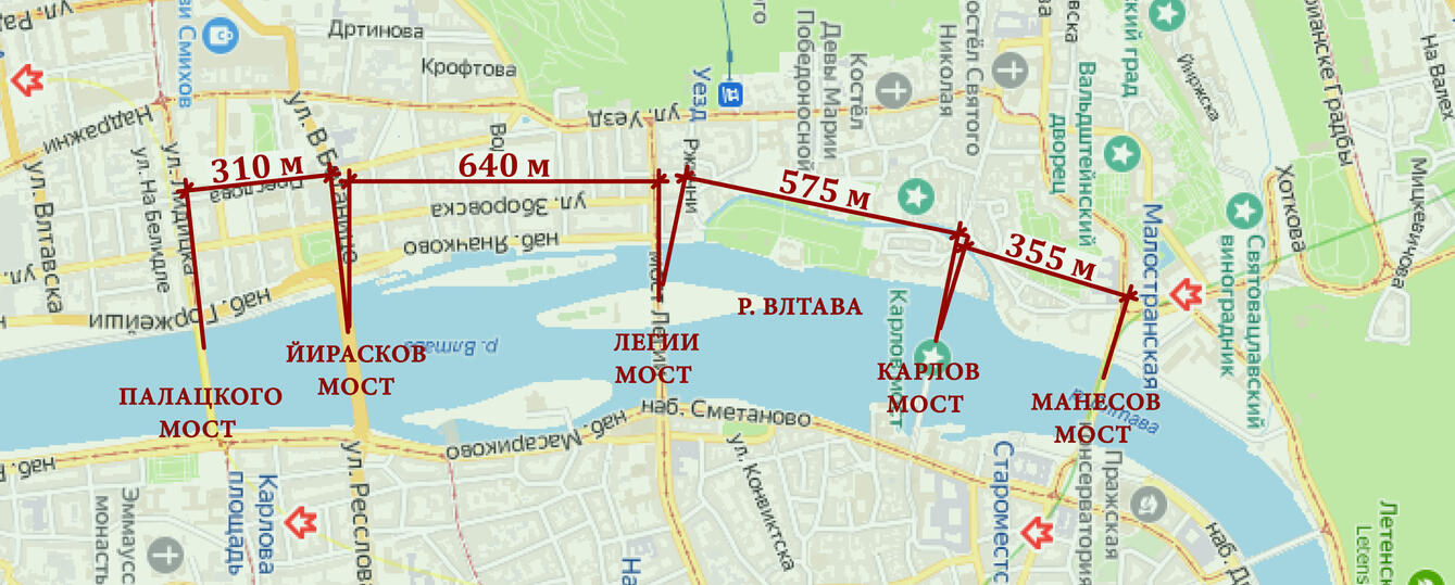 Прага - город в котором множество мостов, где зона туристической активности на расстоянии 1880 м обслуживается пятью мостами.